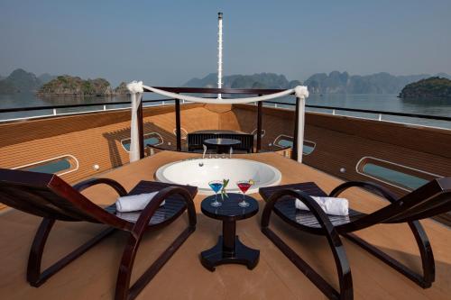 A splendid lunch is served at Tahiti Restaurant while cruising into the primitive Lan Ha Bay. The bay has hundreds of small and large islands, making it an enormous, wonderful scene to look at while dining.